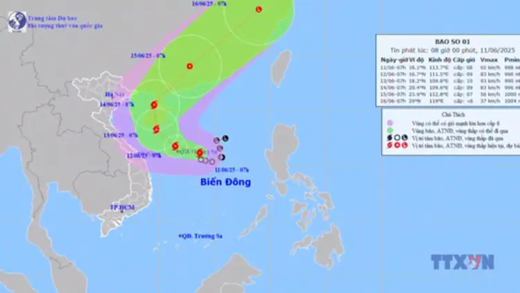 Sáng 11/6, áp thấp nhiệt đới mạnh lên thành Bão số 1, biển động mạnh, nhiều nơi mưa lớn. Dự báo, trong khoảng 24 giờ tới, áp thấp nhiệt đới sẽ di chuyển theo hướng Tây Tây Bắc, khoảng 10 km/giờ và có khả năng mạnh lên thành Bão số 1. Biển động, gió mạnh cấp 6-7, sau tăng lên cấp 8-9, giật cấp 11, sóng biển cao 2,5-4,5m. Tàu thuyền trên biển có khả năng chịu tác động của dông, lốc, gió mạnh, sóng lớn.
