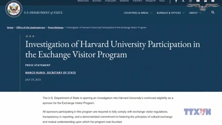 Bộ Ngoại giao Mỹ ngày 23/7 đã thông báo mở cuộc điều tra về việc Đại học Harvard tham gia một chương trình dành cho các nhà nghiên cứu và khách mời quốc tế.